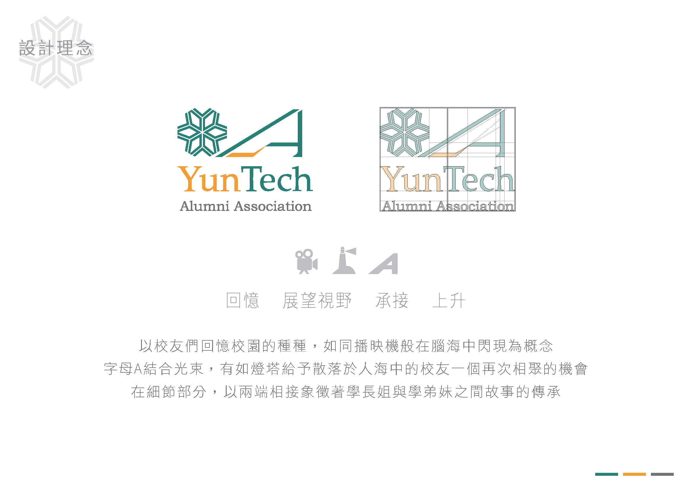 以校友們回憶校園的種種,如同播映機般在腦海中閃現為概念 字母A結合光束,有如燈塔給予散落於人海中的校友一個再次相聚的機會 在細節部分,以兩端相接象徵著學長姐與學弟妹之間故事的傳承